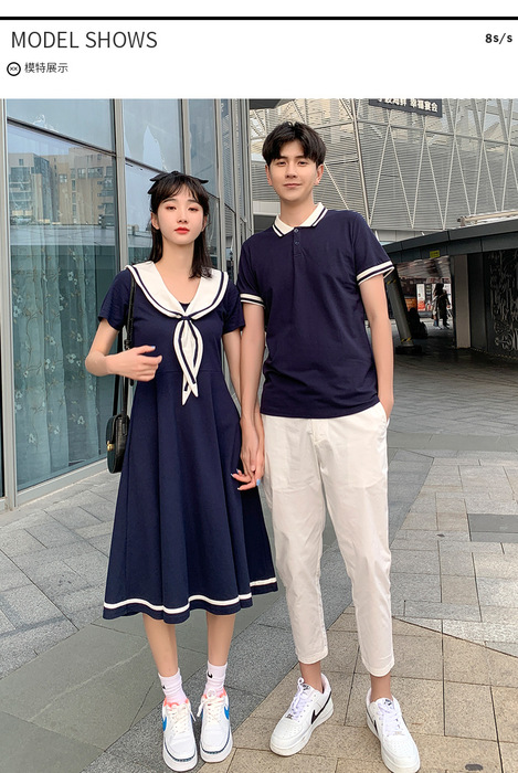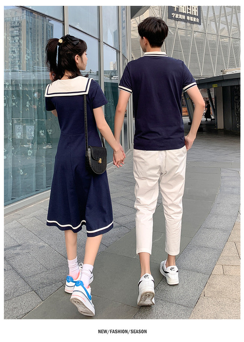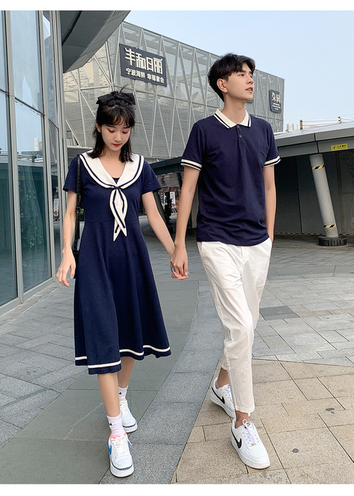 紺色なので落ち着いた印象になります。制服風のおしゃれなコーディネイトです。 メンズ一式(Tシャツ&パンツ) レディース一式(ワンピース)