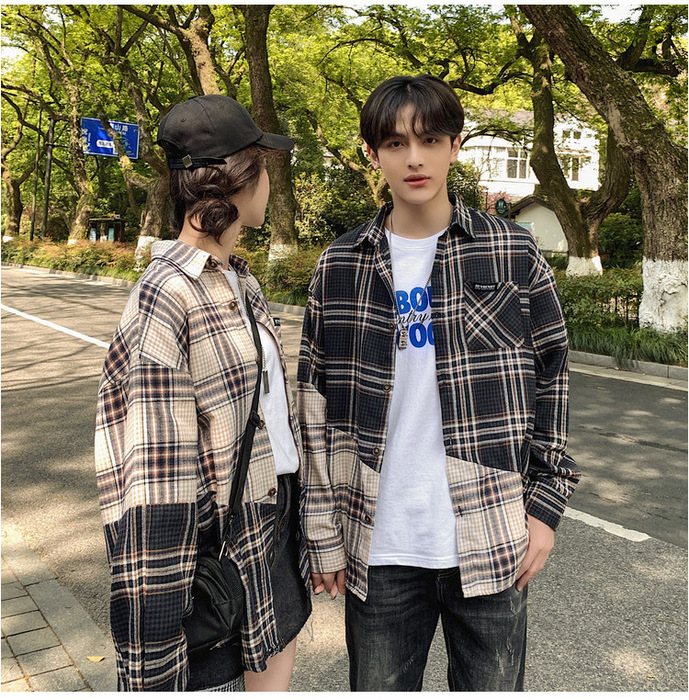 バイカラーチェック柄シャツ。ペアルックしやすい1枚となっております。