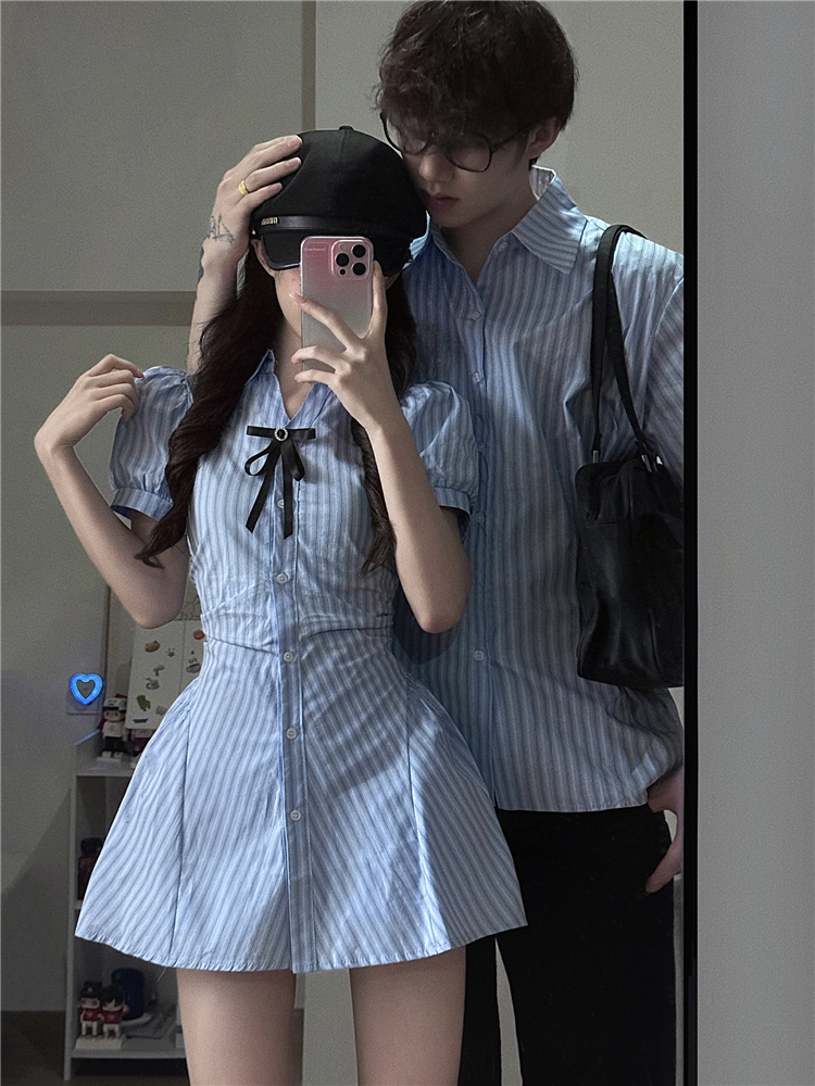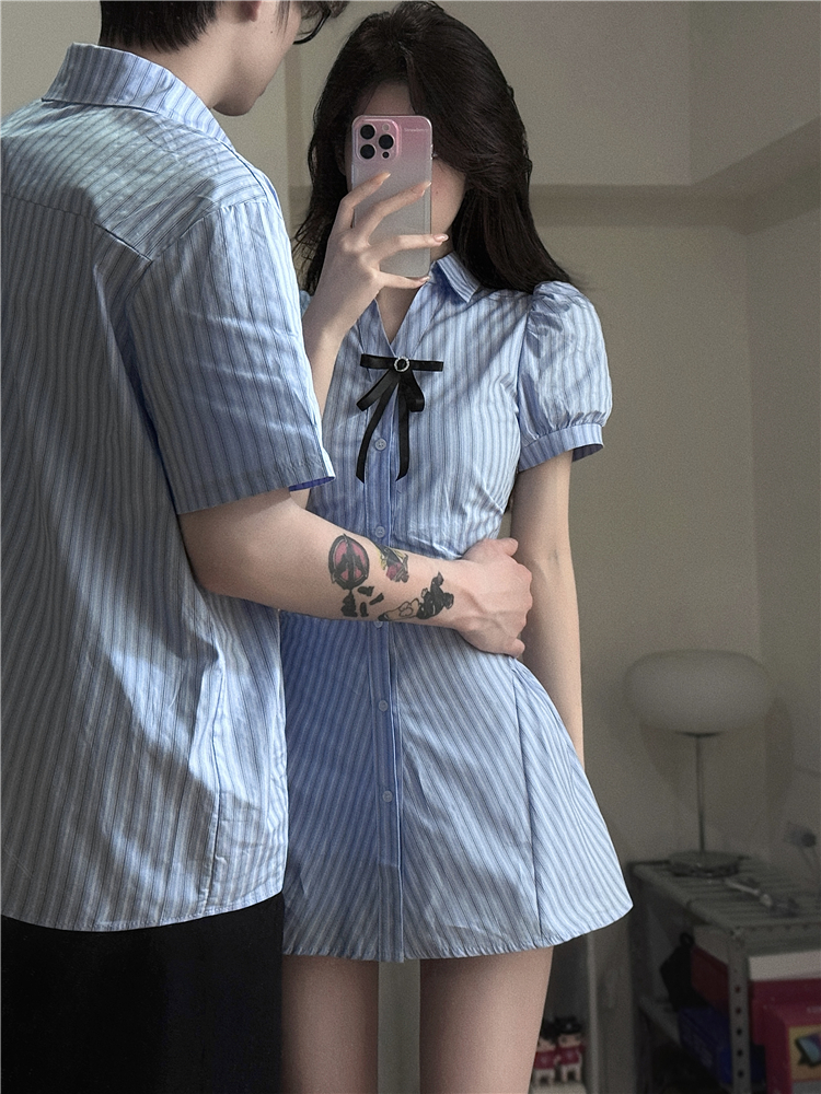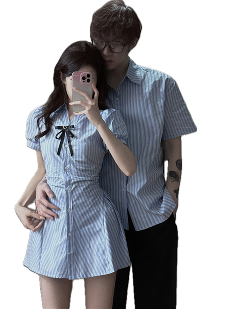 優雅な縦縞模様に上品なリボンの装飾が特徴的なペアルックのTシャツです。 女性用はワンピース風のデザインで、男性用は標準的なシャツ丈になっています。 柔らかな質感の生地で作られており、カップルでのお出かけや記念日に最適なTシャツペアルックです。 同じ縦縞柄でありながらも、それぞれの体型に合わせたシルエットで、おしゃれな統一感を演出します。