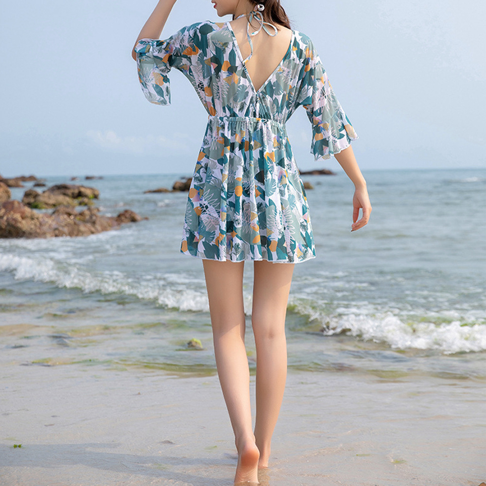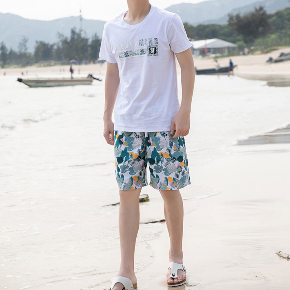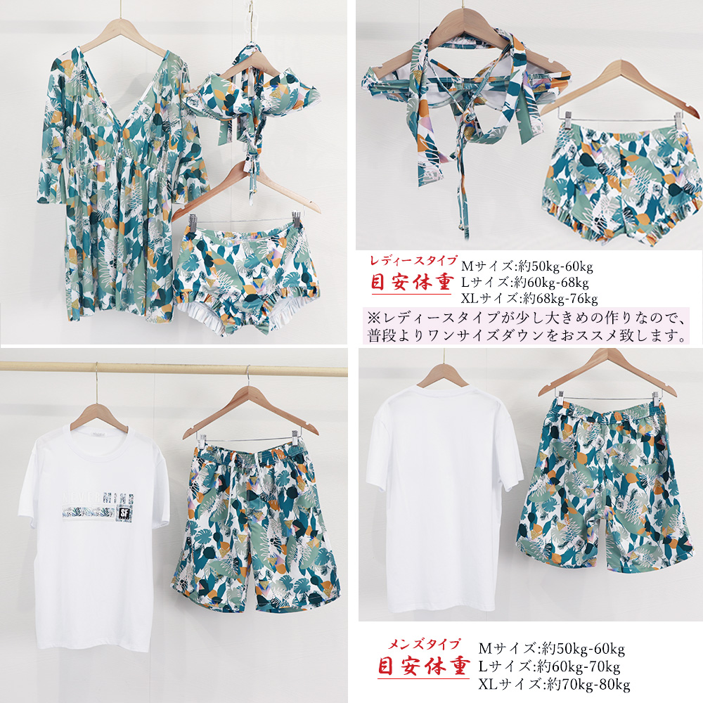 女性用はビキニとカバーアップワンピース、男性用は白ティーシャツと花柄ショートパンツのセット。