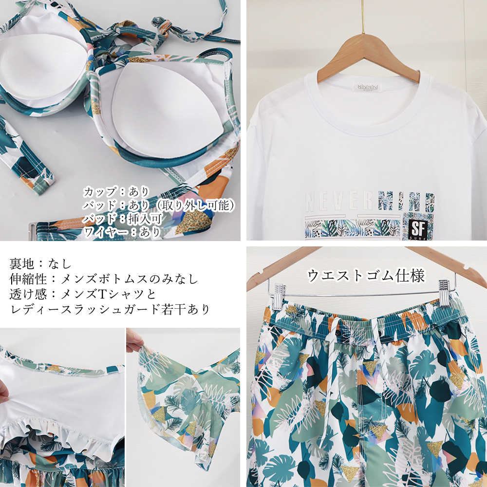 メンズ Tシャツ素材: 綿95%+ポリエステル5% ボトムス素材: ポリエステル95%+綿5% レディース ラッシュガード素材:ポリエステル85%+ポリウレタン15% 水着素材:ポリエステル85%+ポリウレタン15% タイプ:メンズ/レディース サイズ:M/L/XL メンズ Tシャツ:着丈約69/70/71cm 肩幅約43/45/48cm 袖丈約20/20/20cm 胸囲約96-112/100-116/104-120cm ボトムス:着丈約49/50/51cm ウエスト約68-96/70-100/76-106cm ヒップ約114/118/122cm レディース ラッシュガード:着丈約71/72/73cm 袖丈約39/40/41cm ウエスト約62-114/68-120/72-124cm 胸囲フリー ブラトップ:トップバスト約68-78/72-82/76-86cm アンダーバスト約66-76/68-78/70-80cm パンツ:着丈約23/23/23cm ウエスト約66-100/68-102/70-104cm ヒップ約86-106/90-110/94-114cm カップ:あり パッド:あり(取り外し可能)/挿入可 ワイヤー:あり ※すべて平置きサイズです(採寸方法違いより、多少の誤差がございますので、ご了承ください)。